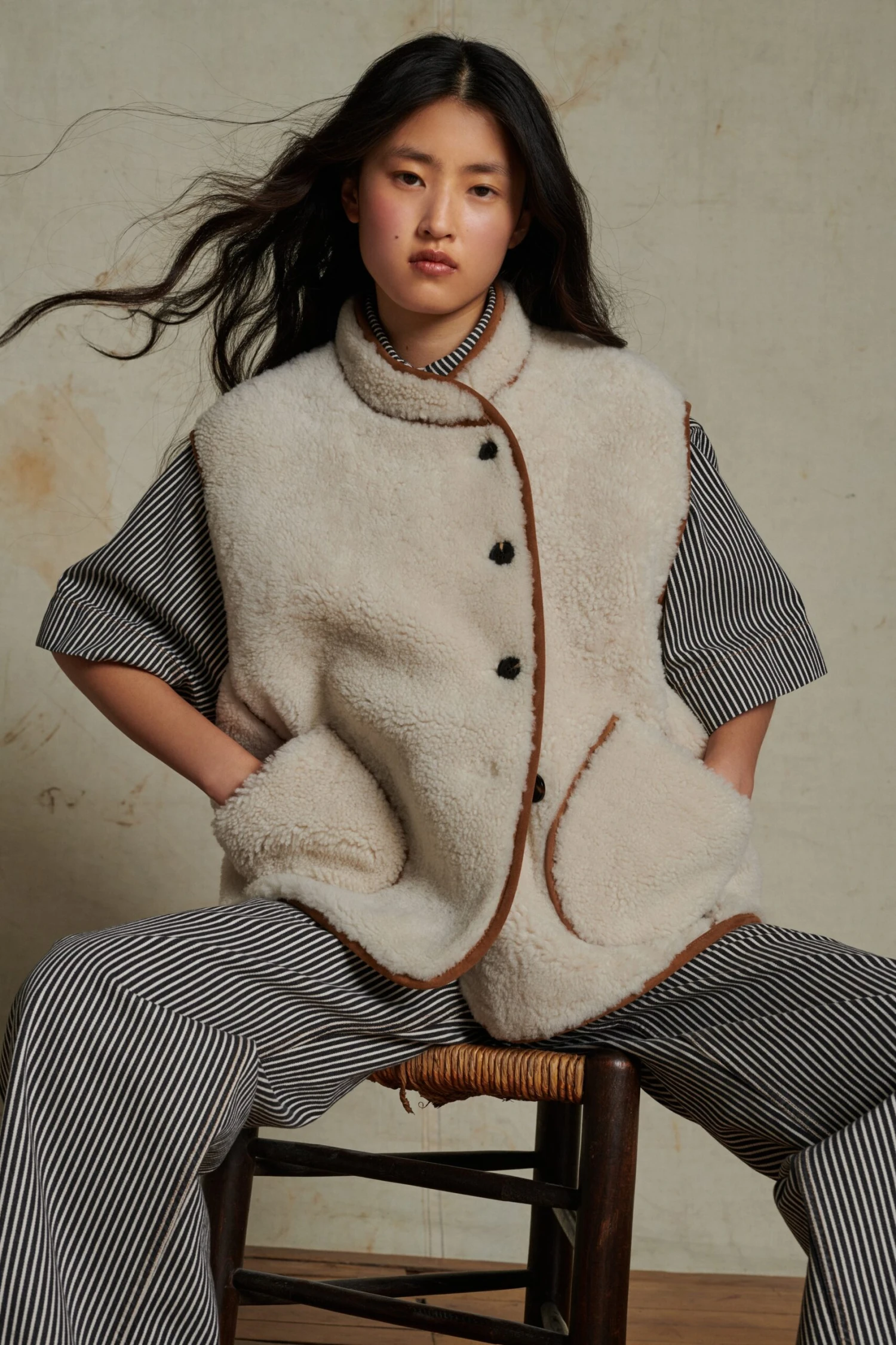 ARNOLD est un gilet oversize en peau lainée que l’on peut superposer à volonté ou glisser sous un manteau large. Son lainage est particulièrement chaud. Un jeu de ganses en peau naturelle souligne les poches plaquées rondes, le pied de col montant et les empiècements qui composent le vêtement.