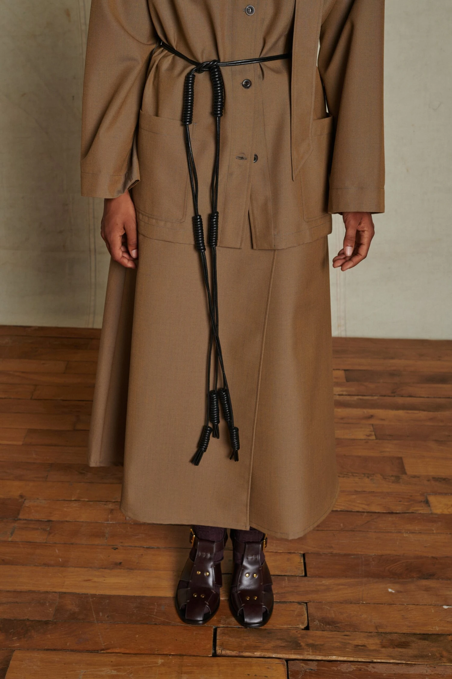 ANTIGONE est une ceinture en cuir composée de deux liens souples et de nœuds faits à la main. À ceinturer en double tour sur une veste, une robe, ou un gros pull afin d’en structurer la silhouette.