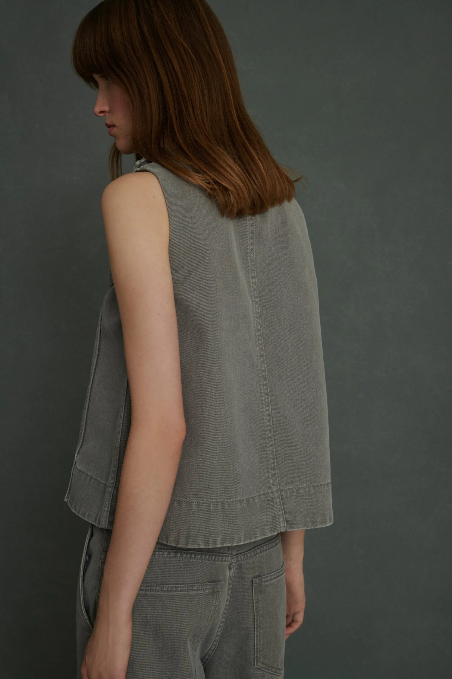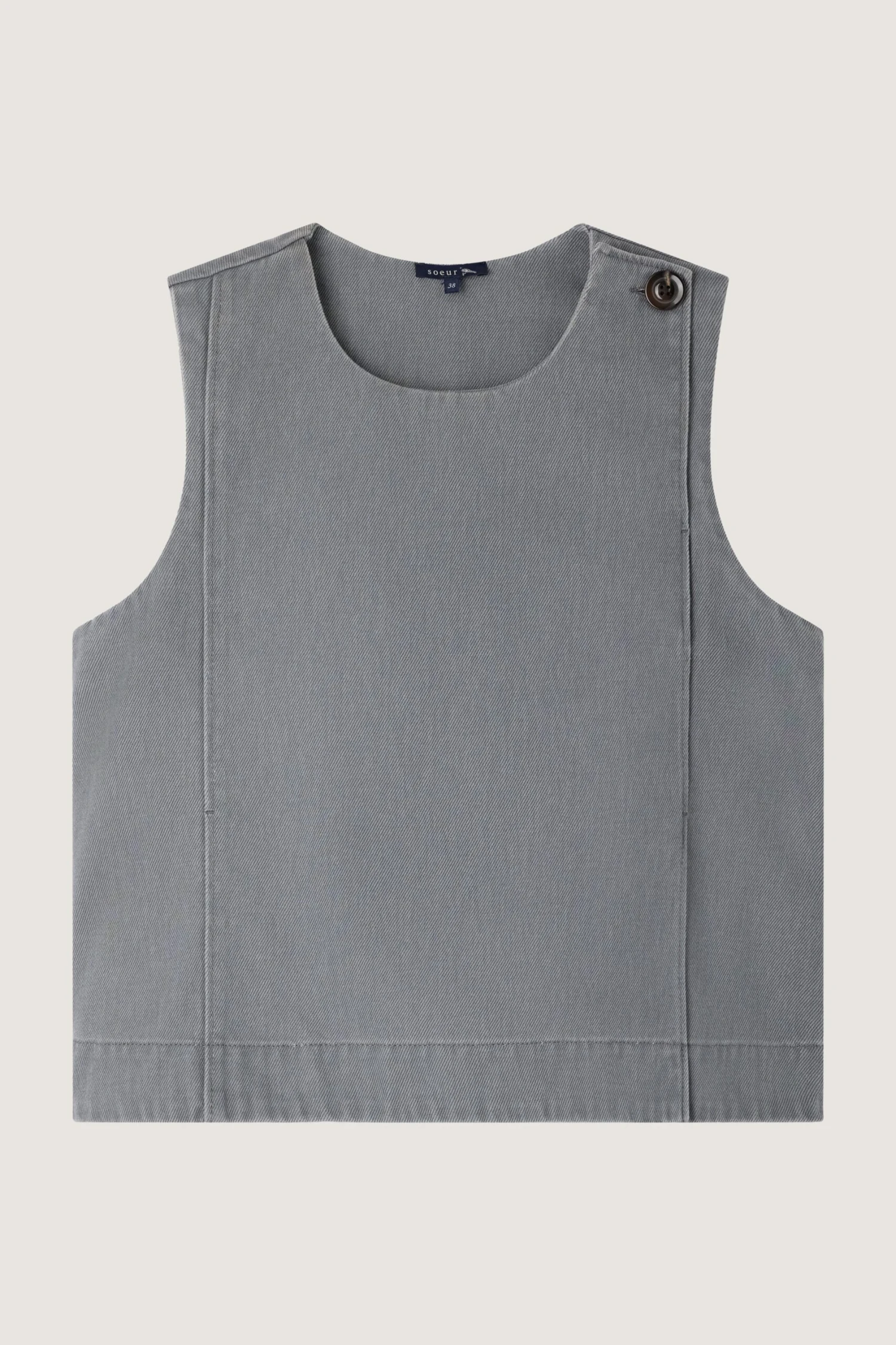AURORE est un top sans manches en toile de denim souple. L’emmanchure carrée ajoute à son volume ample et trapèze. Un panneau au milieu est fixé à mi-hauteur et apporte du mouvement. Un bouton au côté décore l’encolure et facilite l’enfilage. A porter en total look avec le jean ALISSIO assorti pour un total look monochrome.