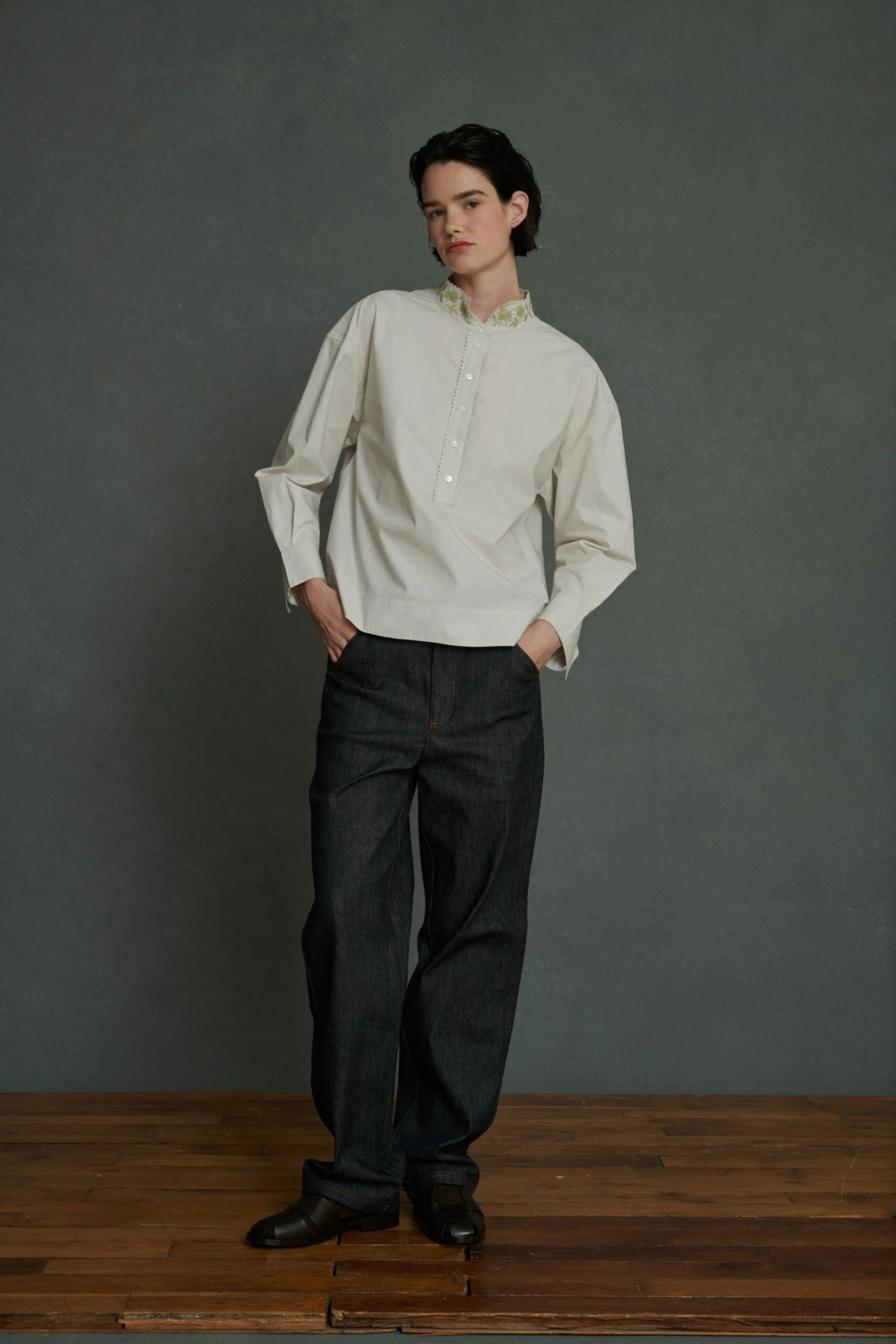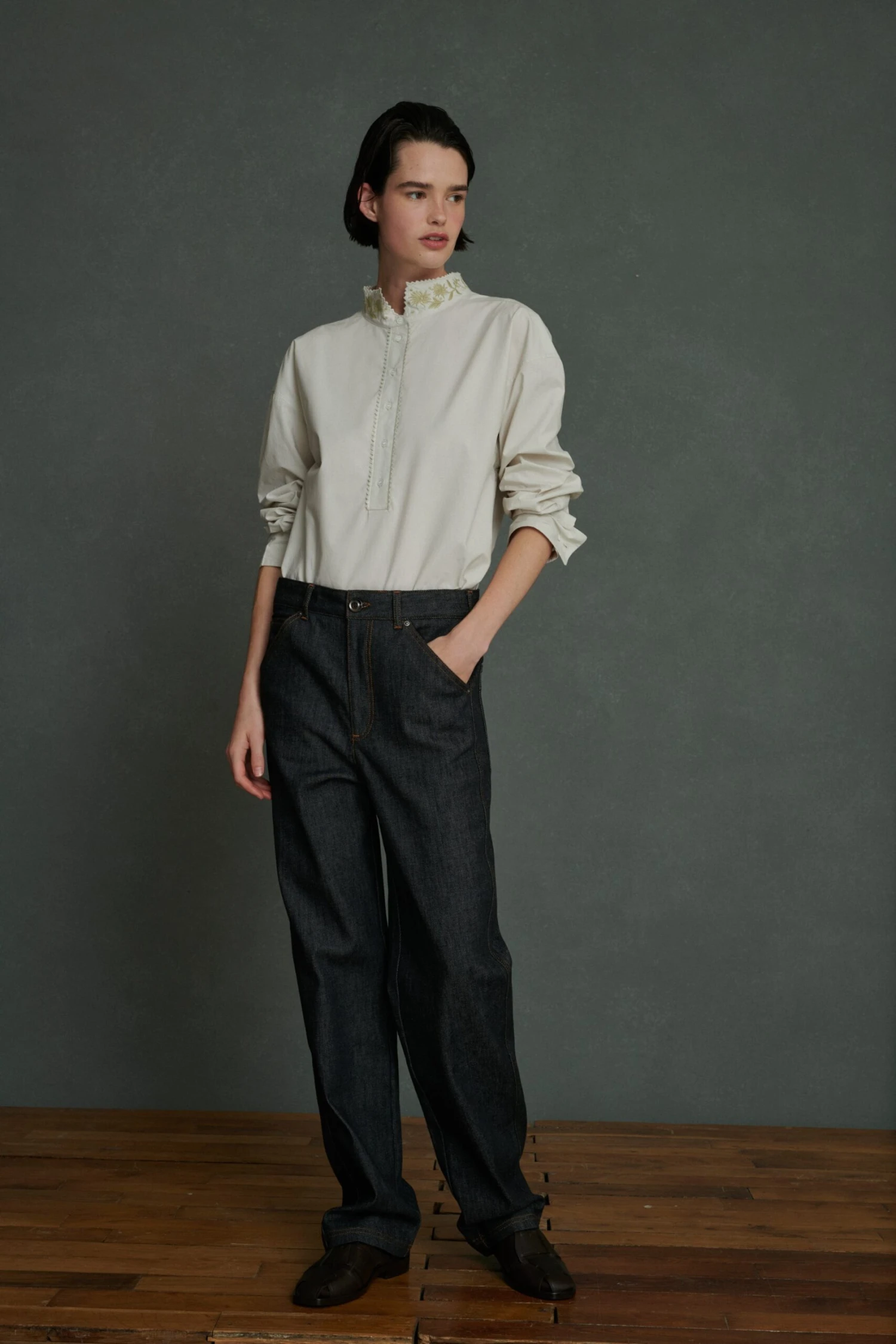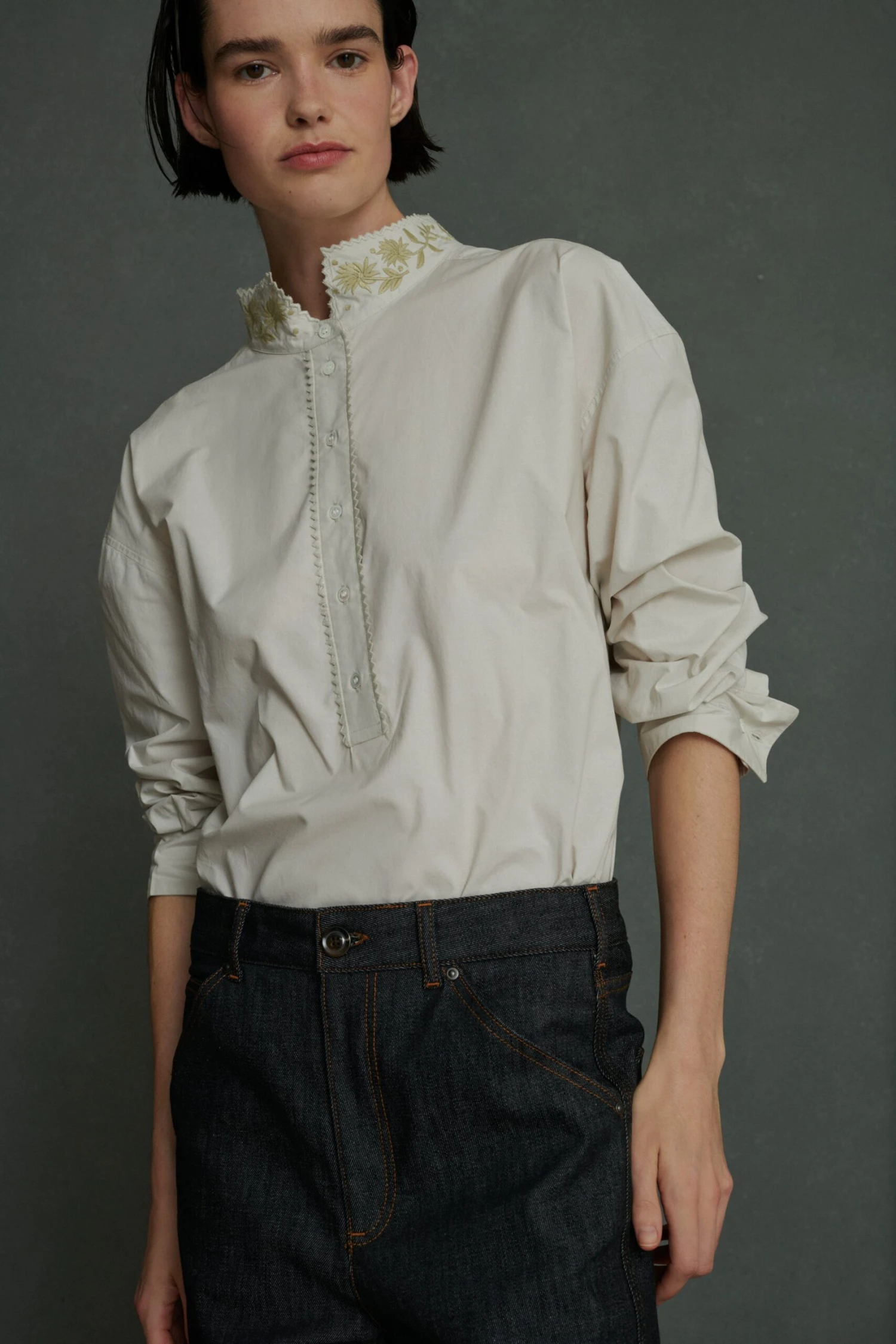 POEME s’inscrit dans la lignée des blouses romantiques iconiques du vestiaire Soeur. Le col et la patte de boutonnage sont entièrement festonnés et brodés. Sur cette version gris perle, les broderies sont en fil de coton beige et de créent un doux contraste.
