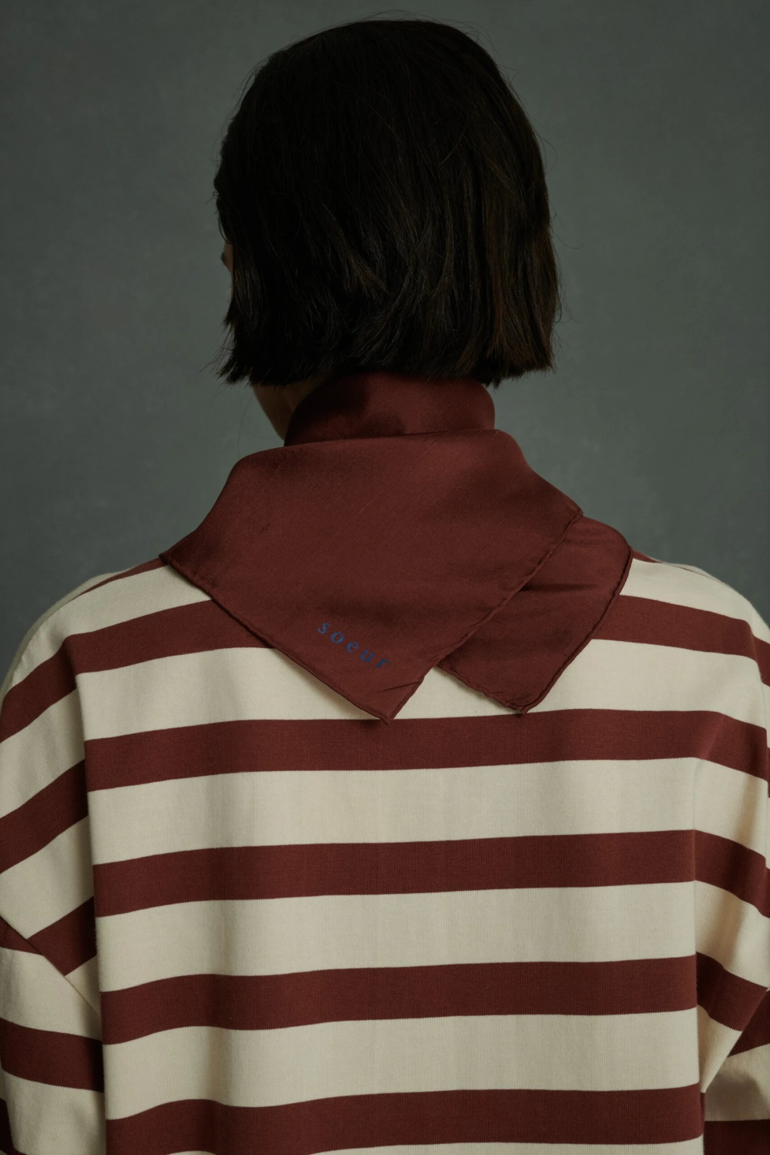 SQUARE est un foulard en soie unie. Signature du vestiaire Soeur, nos carrés en soie apportent une touche d’élégance et de fantaisie à n’importe quelle tenue : noués autour du cou, dépassant discrètement d’un col de chemise ou de pull, noué sur l’anse d’un sac, ou en fichu sur la tête…