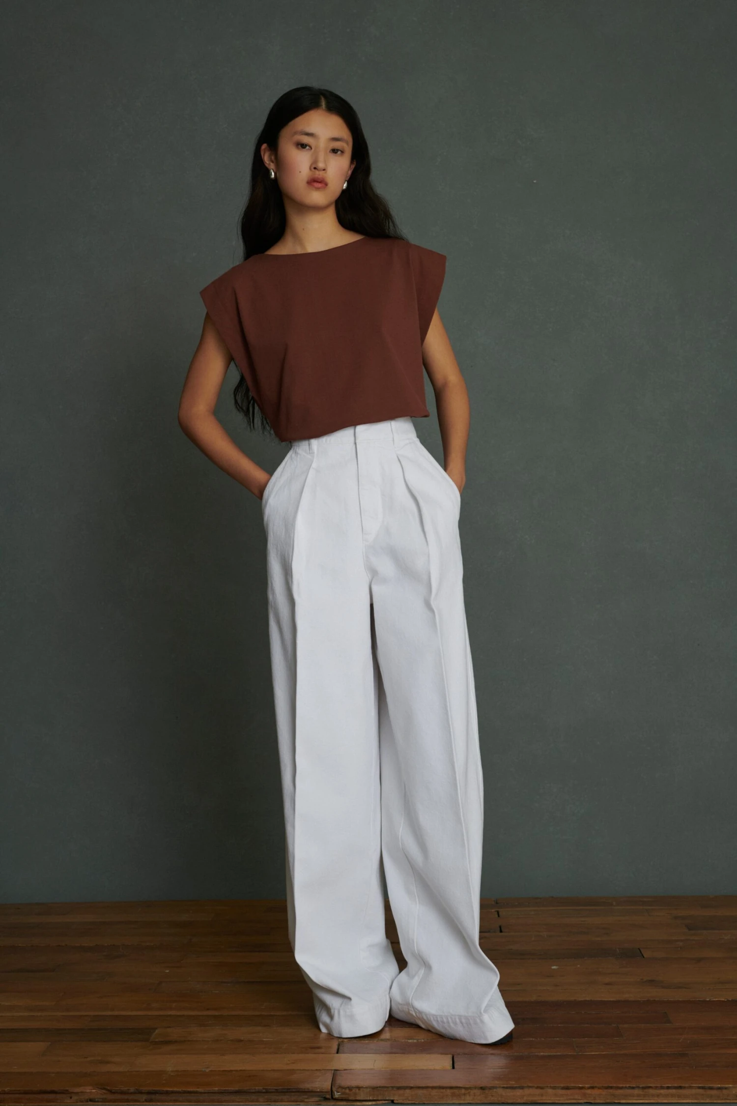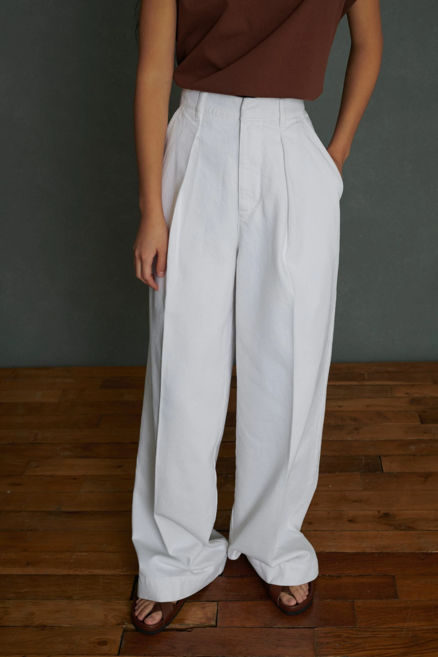 – Pantalon à pinces, coupe large et évasée