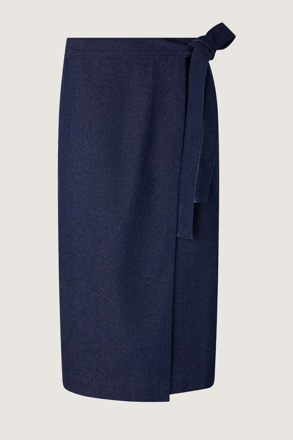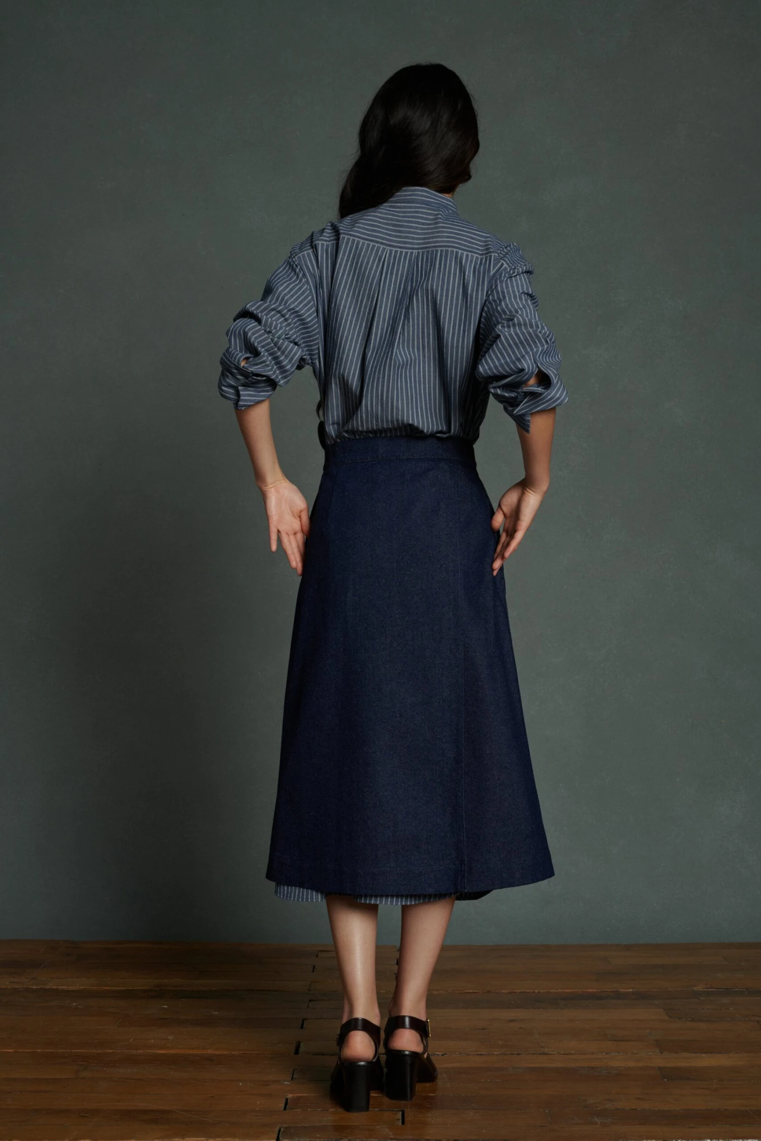 ALINE est une jupe portefeuille asymétrique qui reprend les codes des tabliers à nouer sur le côté. La toile a subi un délavage assouplissant. Les coutures ton-sur-ton mettent en avant les finitions impeccables du vêtement dans une démarche « tailoring » qui détourne les codes traditionnels du denim.