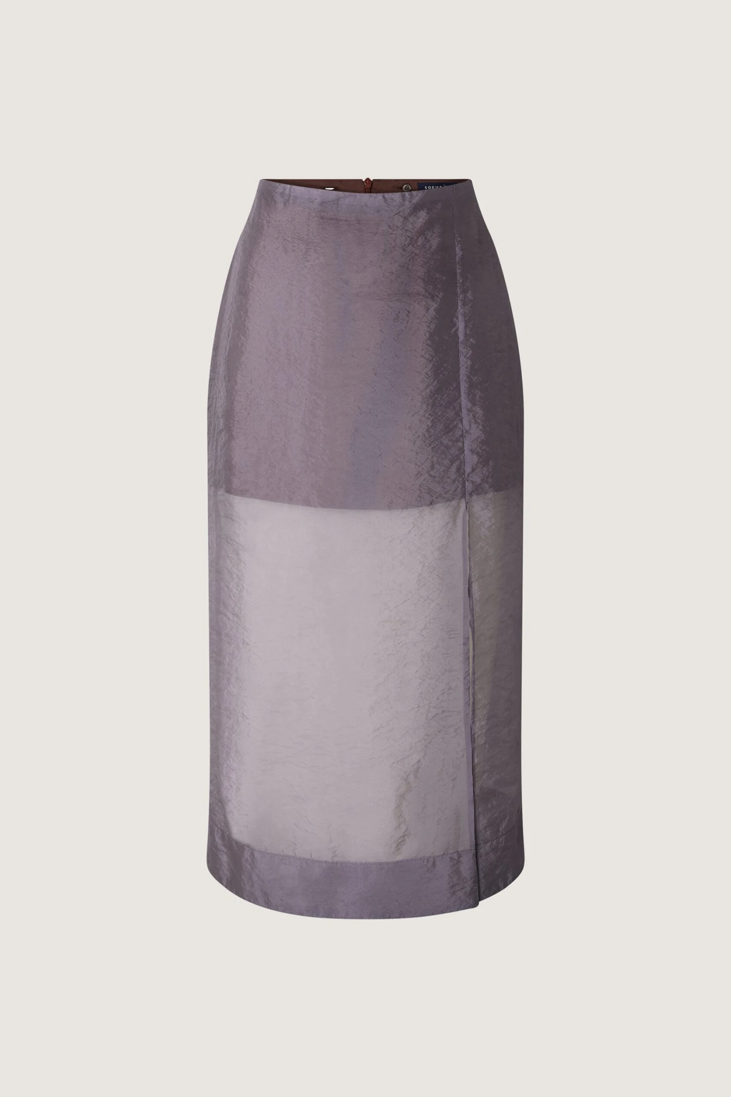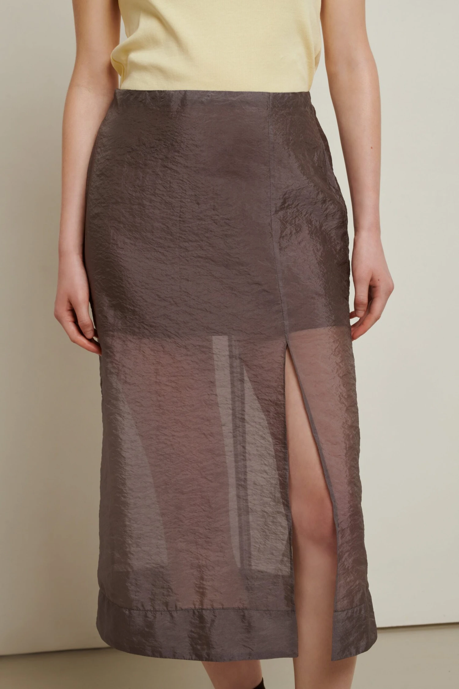 Jupe mi-longue fendue sur le côté en organza gris. L’ajout de coutures anglaise à l’extérieur du tissu apporte de la structure à ce modèle transparent.