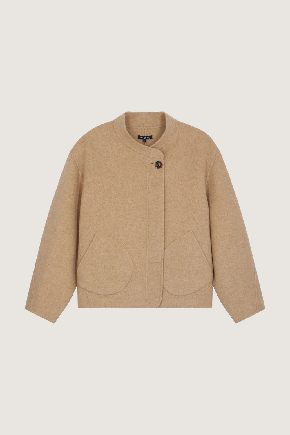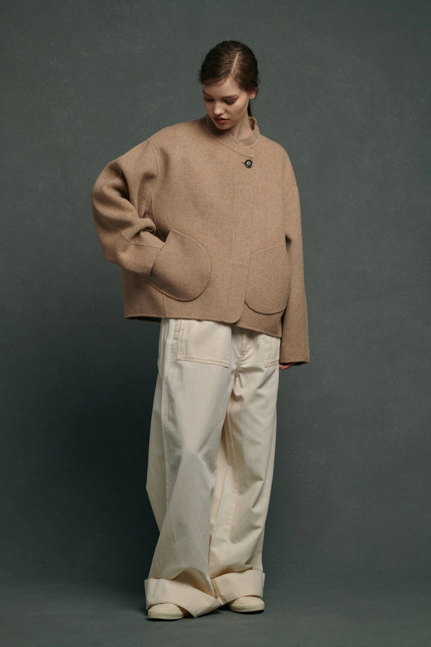 Manteau court en laine double face – Manteau court et ample- Col montant, asymétrique croisure et ouverture semi-cachée boutonnée – Manches longues et rondes – Poches plaquées