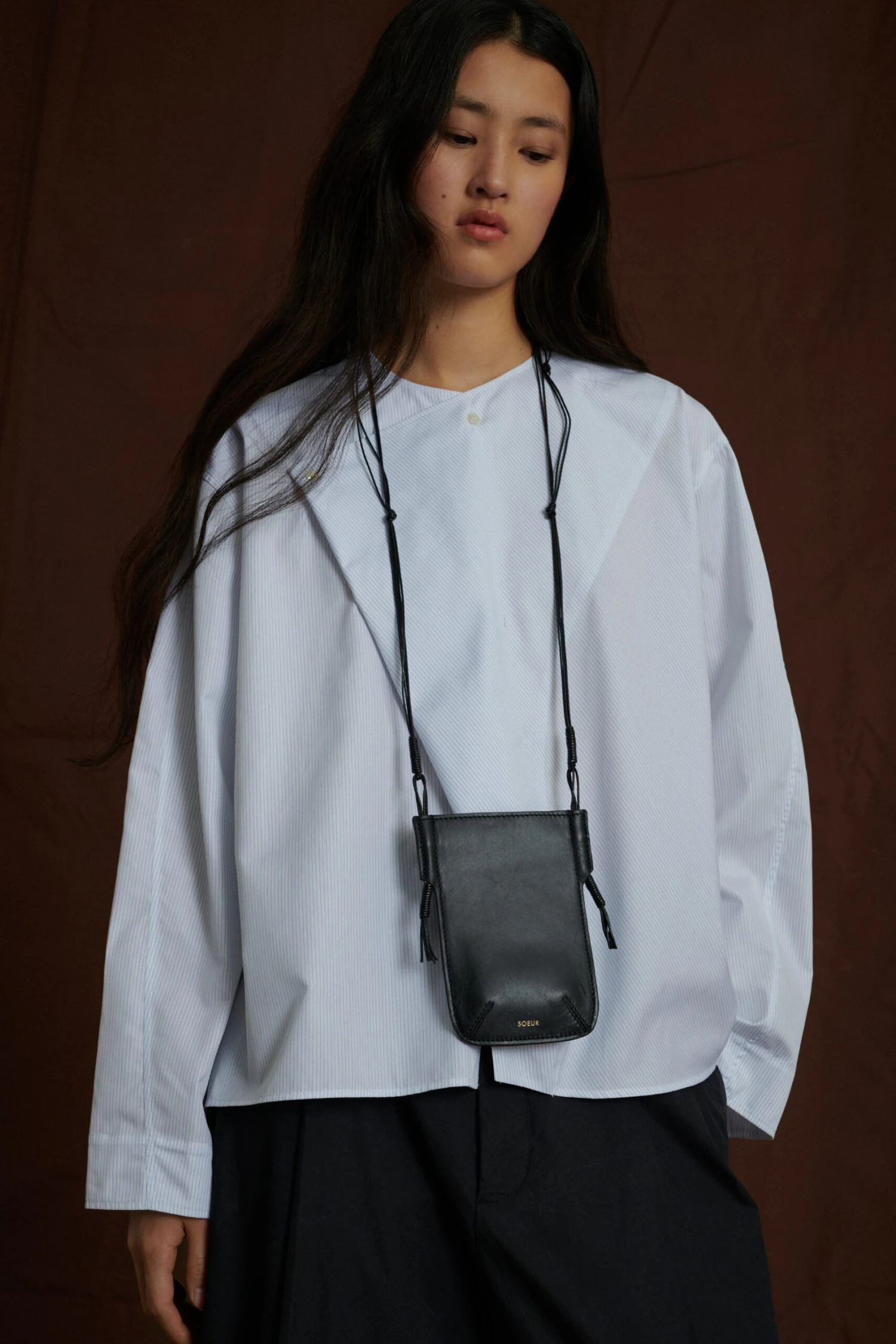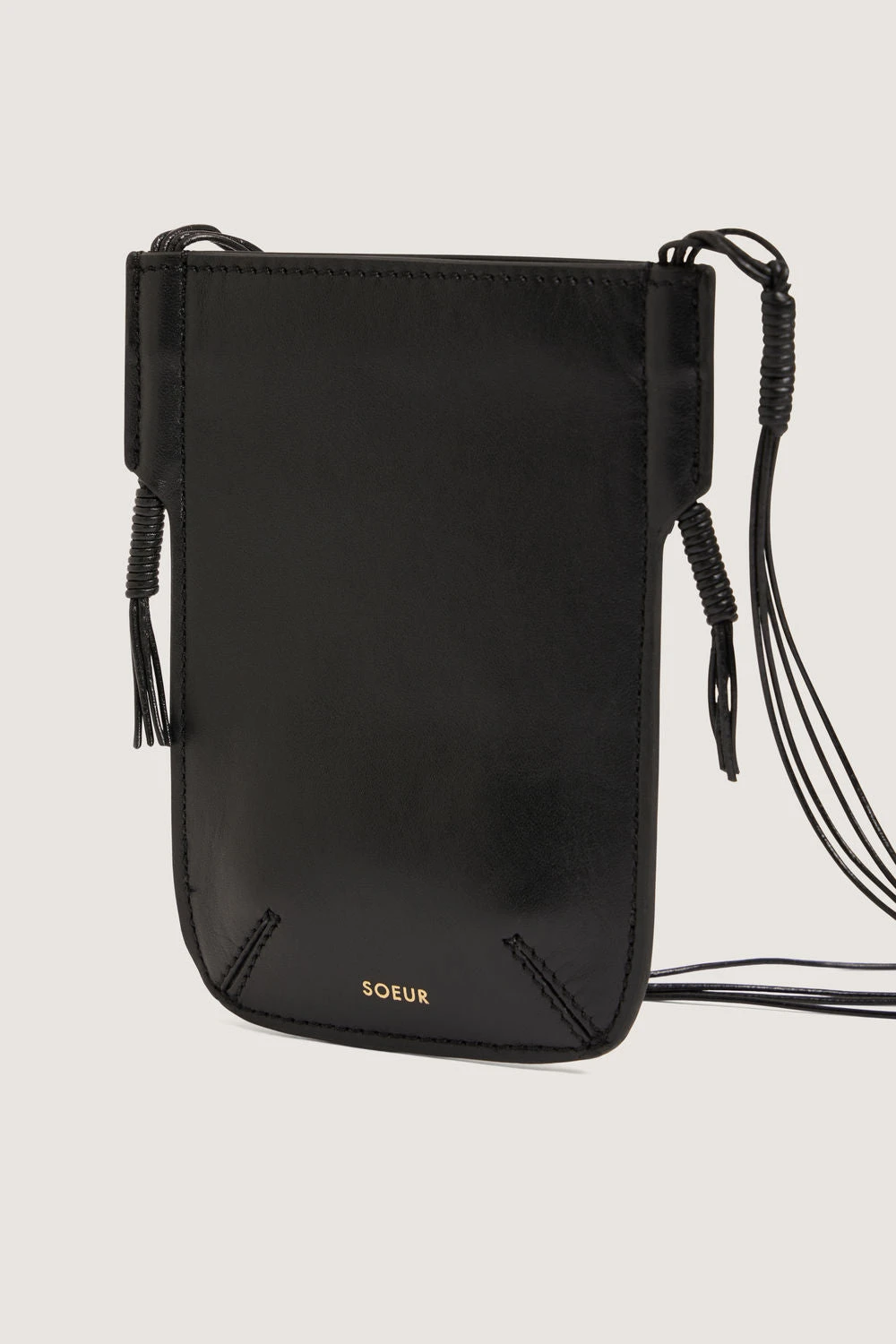 AMAURY est un étui en cuir pouvant contenir un smartphone ou des lunettes. Il est entièrement constitué de liens en cuir noués à la main façon macramé.