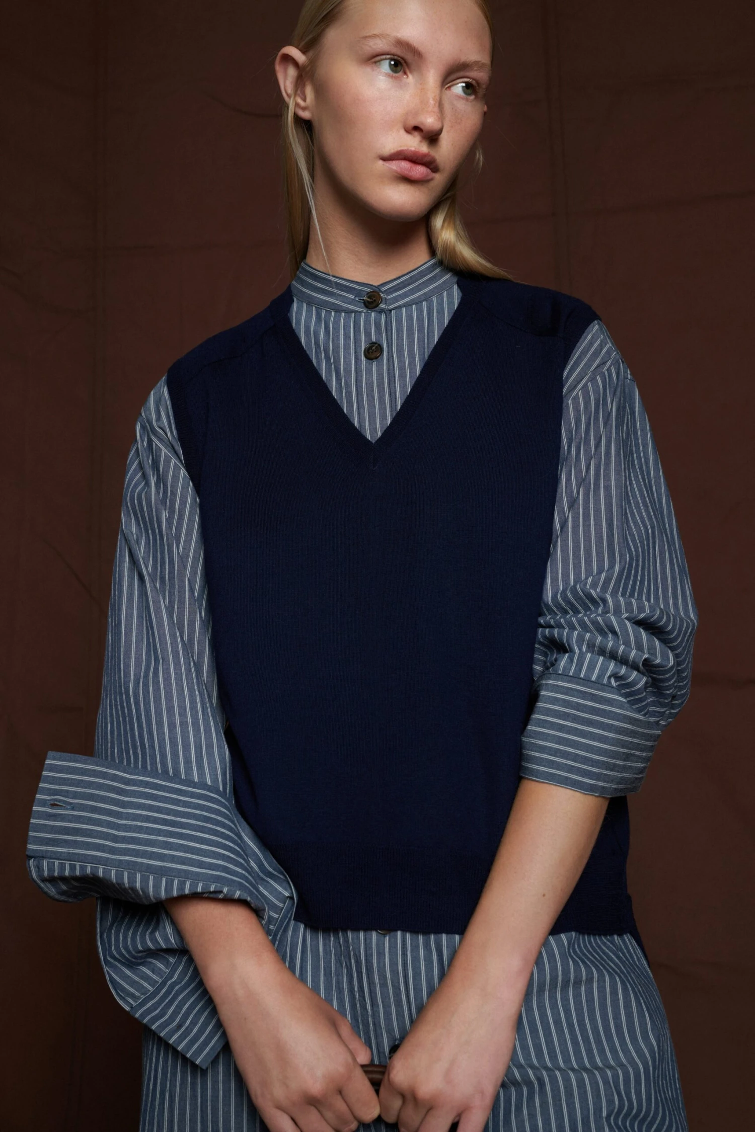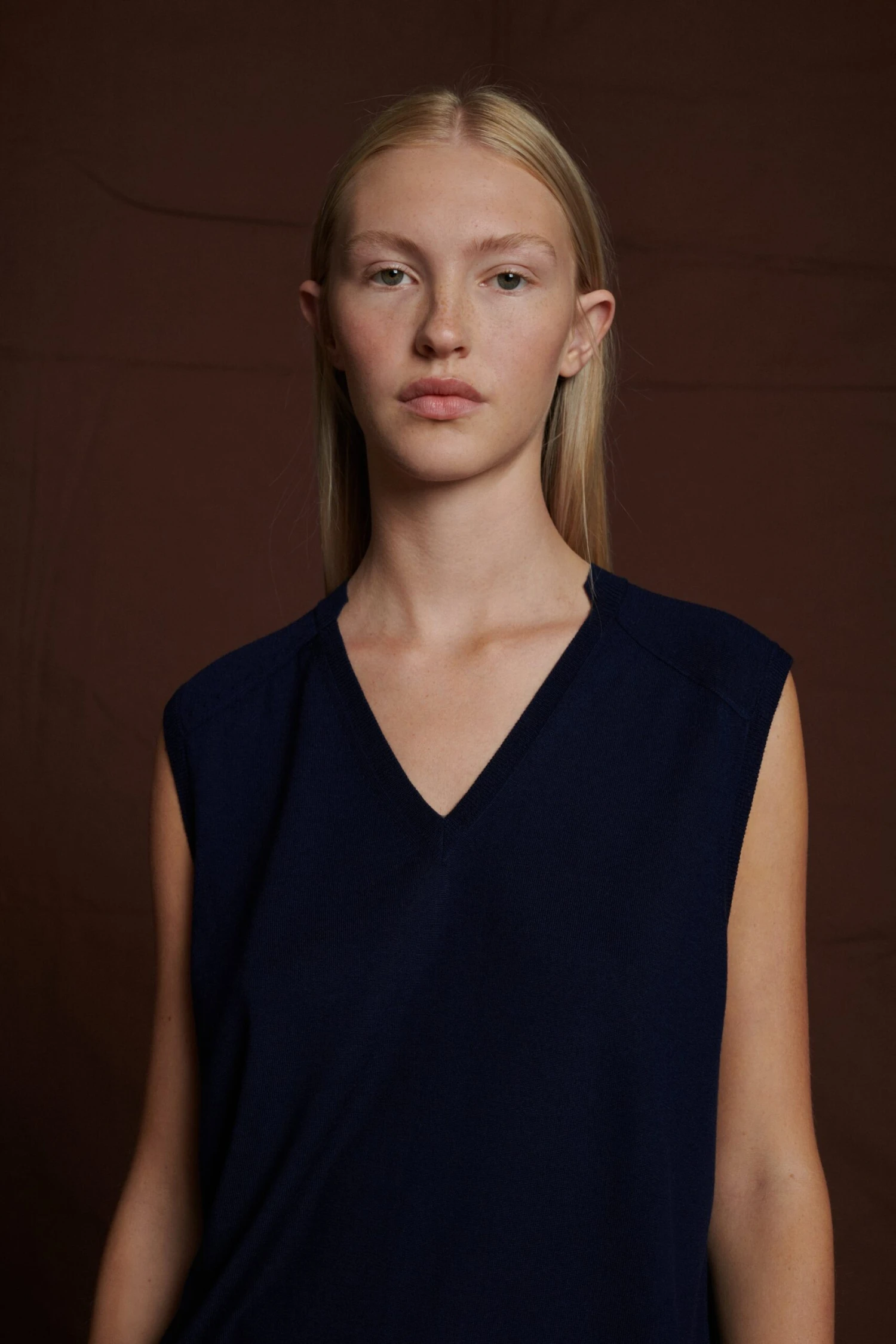 Pull sans manches marine en laine mérinos extra-fine aux finitions asymétriques